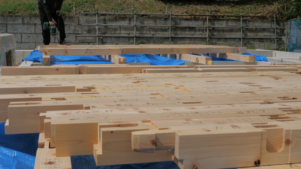 基礎工事も終わり、大工さんがお家を建てる際、最初に行う【土台敷き】が始まりました。