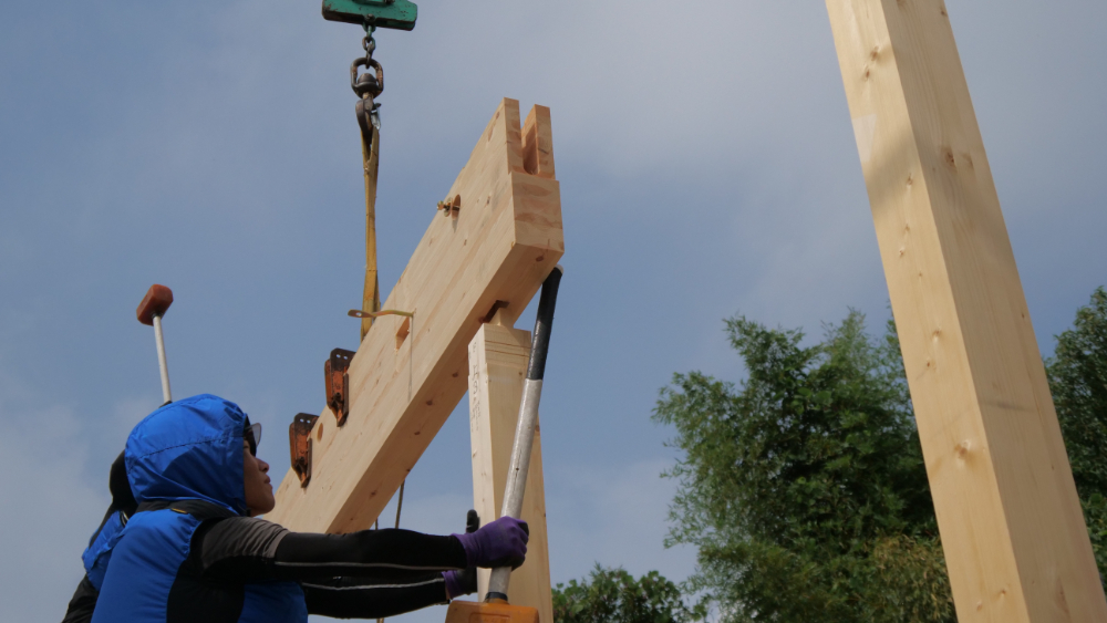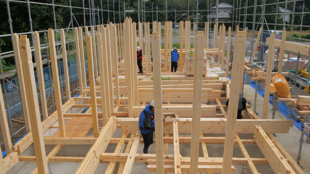 さあ、いよいよ上棟作業です!普段は別の現場で作業をしている大工さん達が集合し、安全第一で進めていきます。