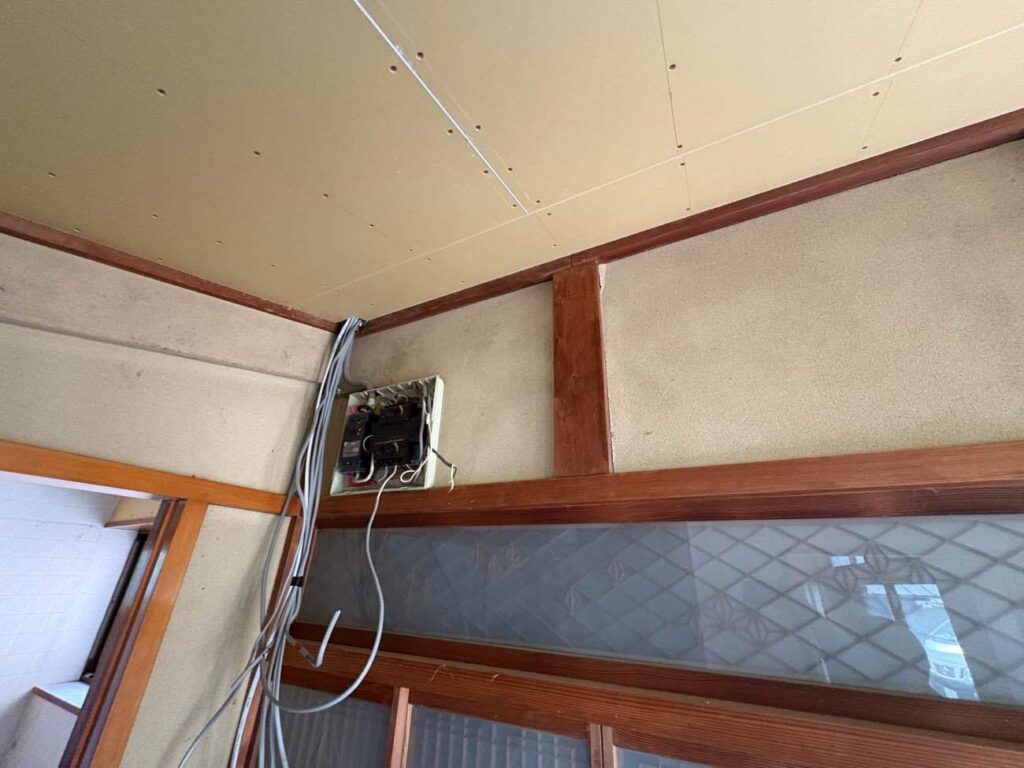 古民家の縁側の突き当たりに設置された分電盤には、新しく引き直した配線が集中してきています。