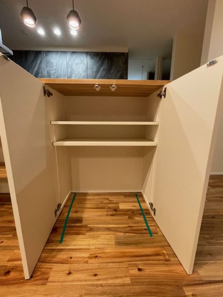 作ったお料理などの配膳に便利ですね。扉の中は可動棚になっていますよ。