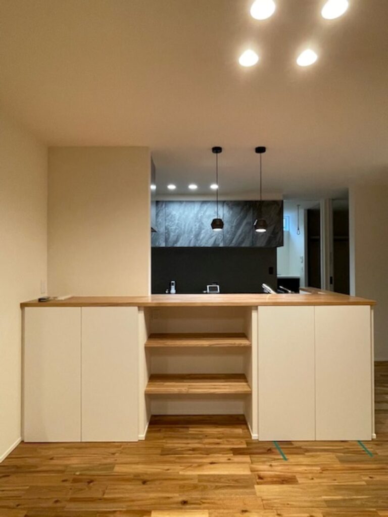 ↓↓こちらはダイニング前に設けた造作の収納棚。天板はカウンターと一体になっているので、