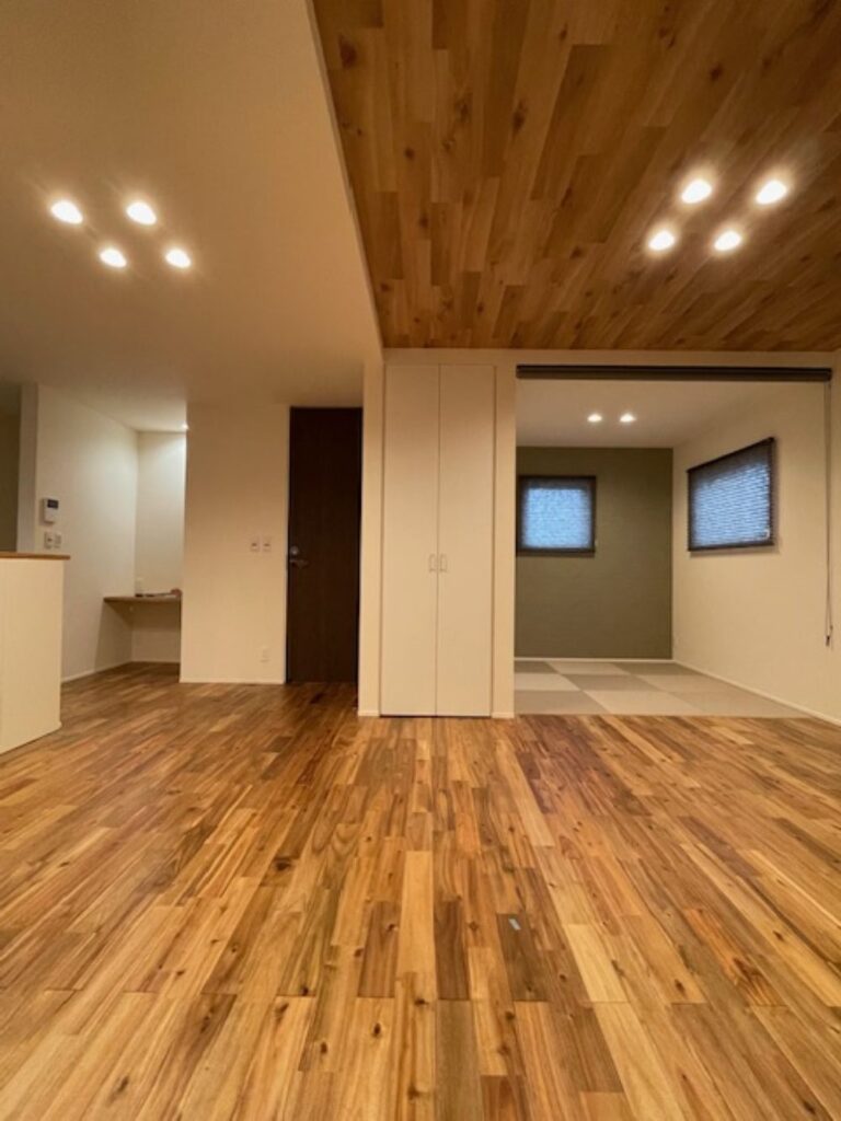 1階は、LDKとつながりのタタミコーナーやご主人のワークスペース、3畳のランドリー・脱衣室、