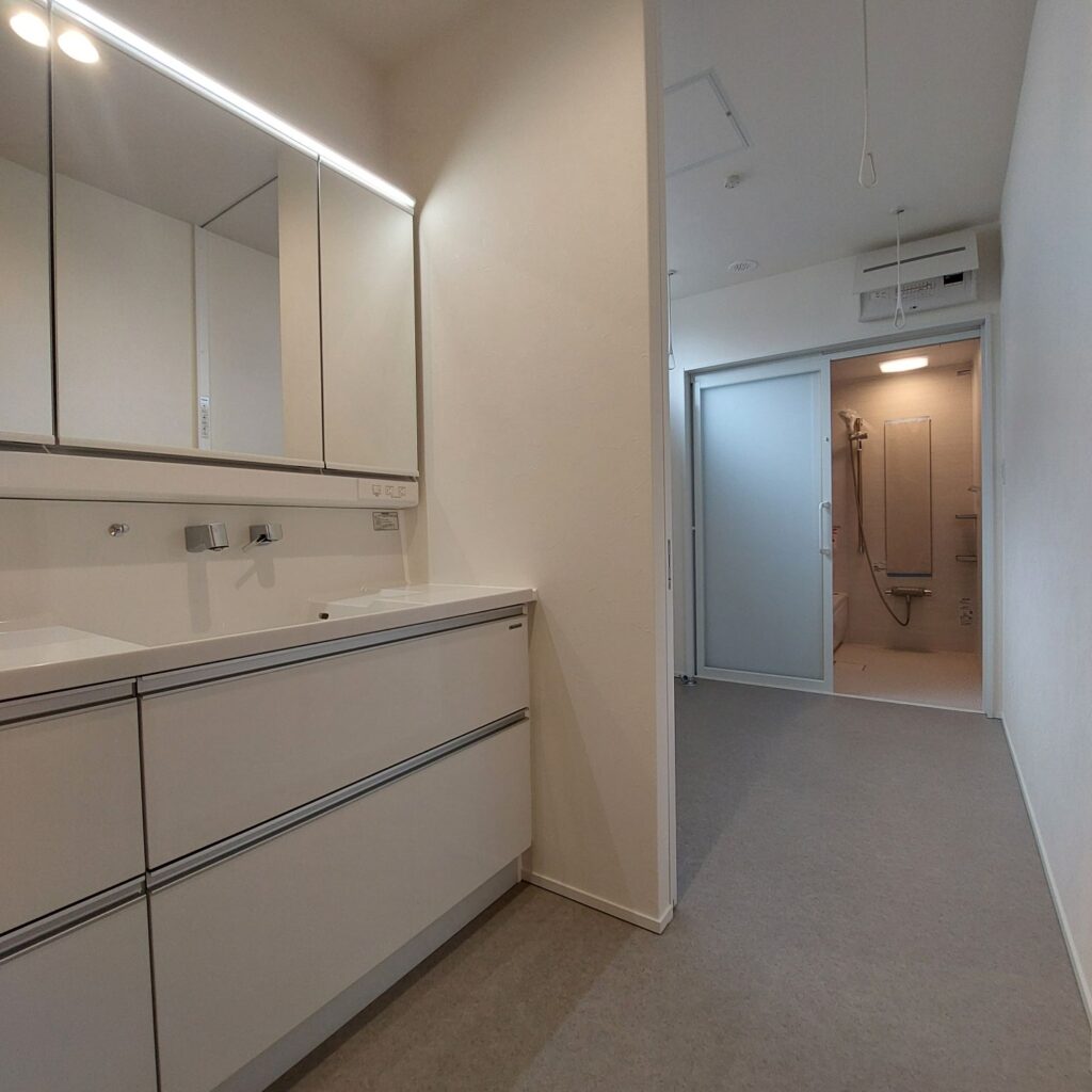 洗面から脱衣のスペース。かなり広々でお洗濯もスムーズにできますね。