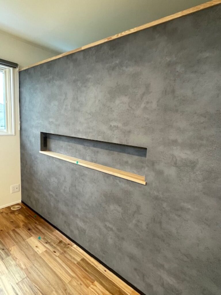 寝室側はニッチに。ゆくゆく手前にベッドを置く想定で、ニッチ内にはコンセントを設けています。