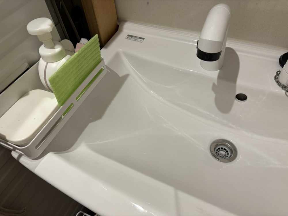 ・手を洗う前にスポンジで洗面台を洗う(洗剤不要)→手を洗って全体を流す。