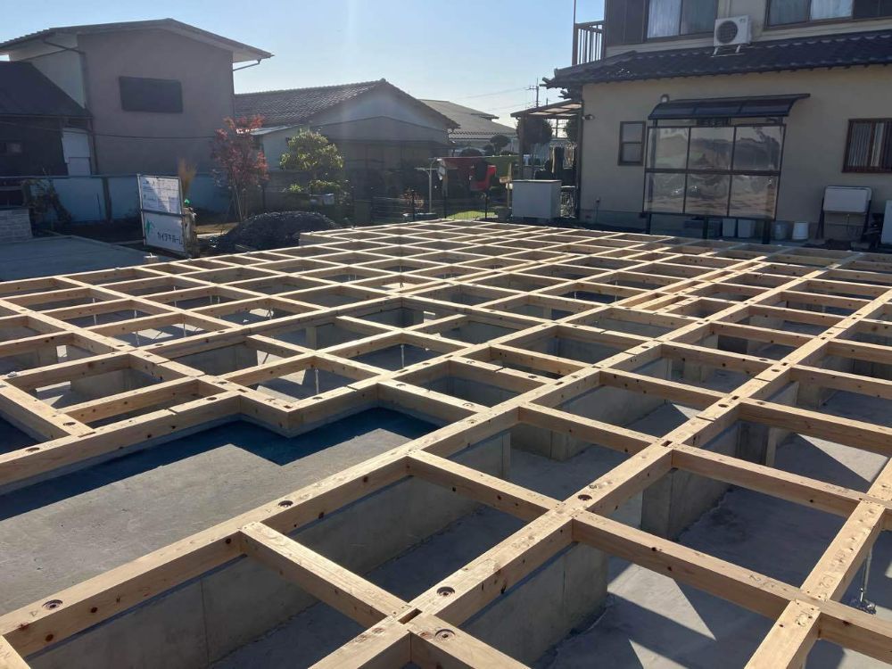 基礎の上に土台が組まれ、上棟へ向けて準備完了です