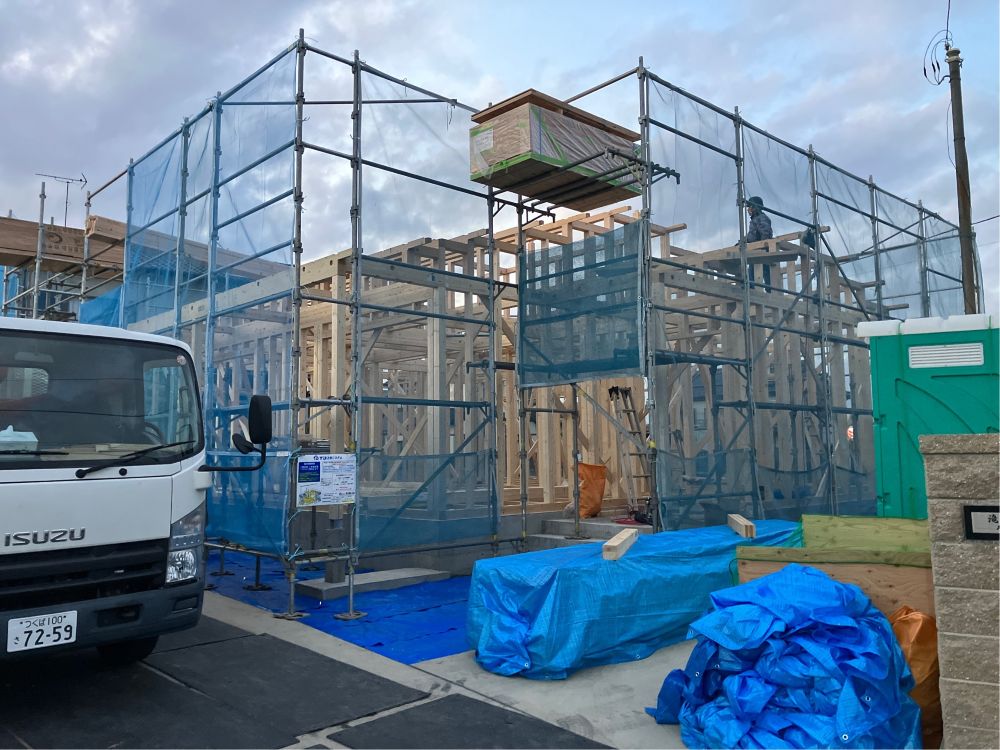 上棟初日は冬らしいひんやりとした空気の中にも、日差しが差し込む穏やかな一日でした