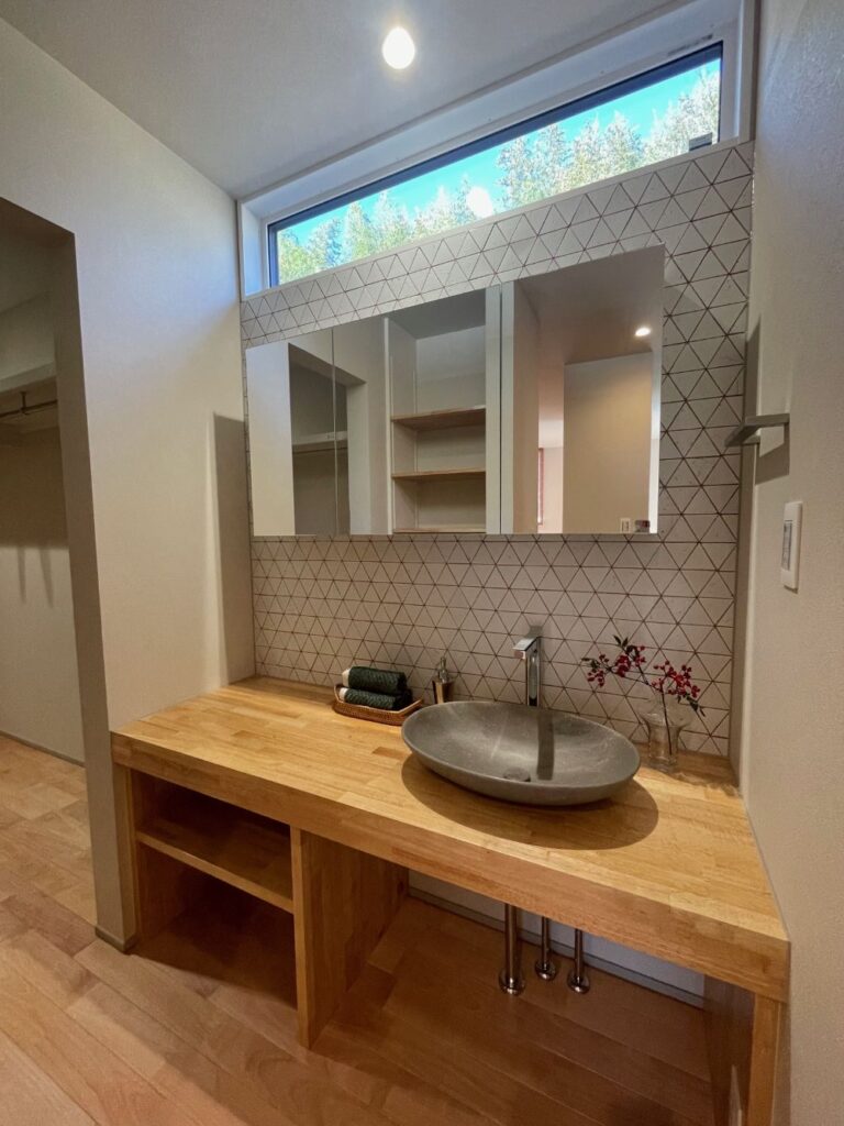 ↓↓洗面台は造作で。下の固定棚には小物が置けますよ。