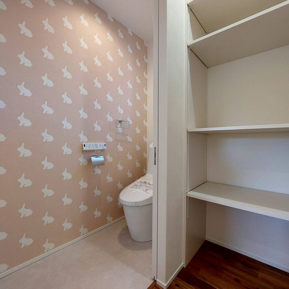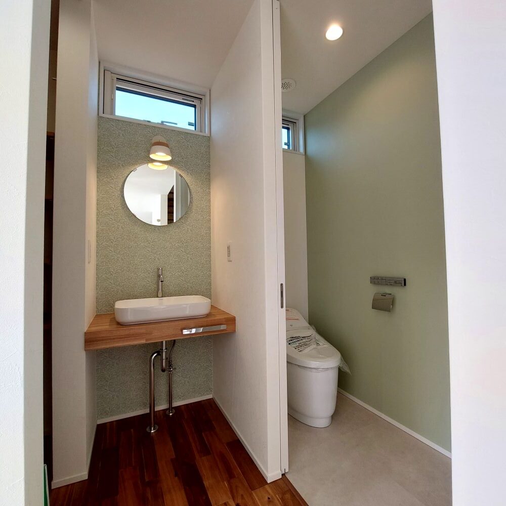 玄関側の手洗いとトイレには、さわやかなグリーンをアクセントに。