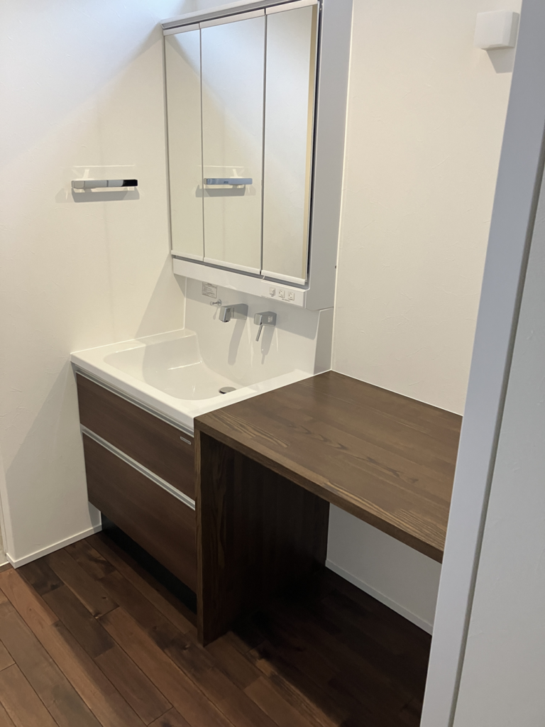 既製品の洗面台と造作カウンターを合わせ家事のスタイルに合わせたご提案となっています!