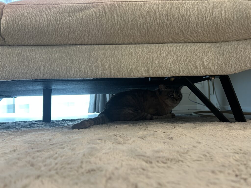 可愛い猫ちゃんが、撮影中ソファの下にじっと隠れていました。可愛すぎる!!