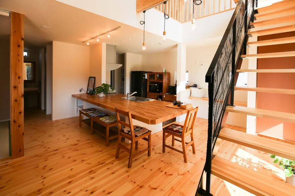 キッチンの床を一段下げる事で、ダイニングに座る家族と同じ目線の高さで会話ができる空間を演出しました。