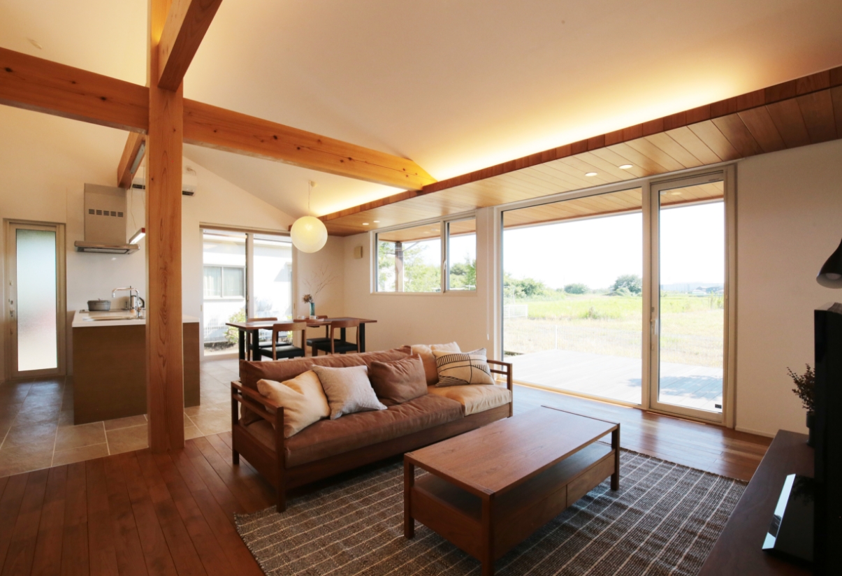 リビングからお庭のウッドデッキにつながる大空間、大きな窓からの自然の景色が、心地よい暮らしを実現します。