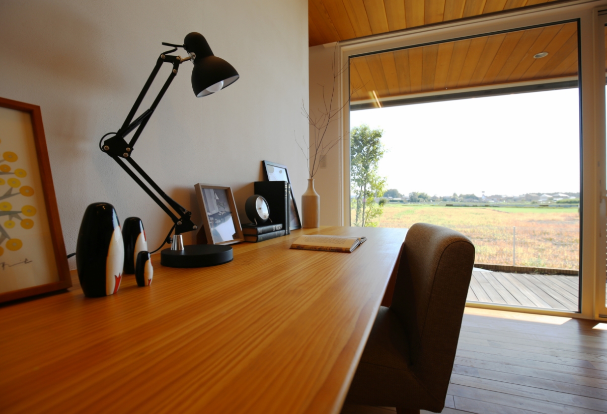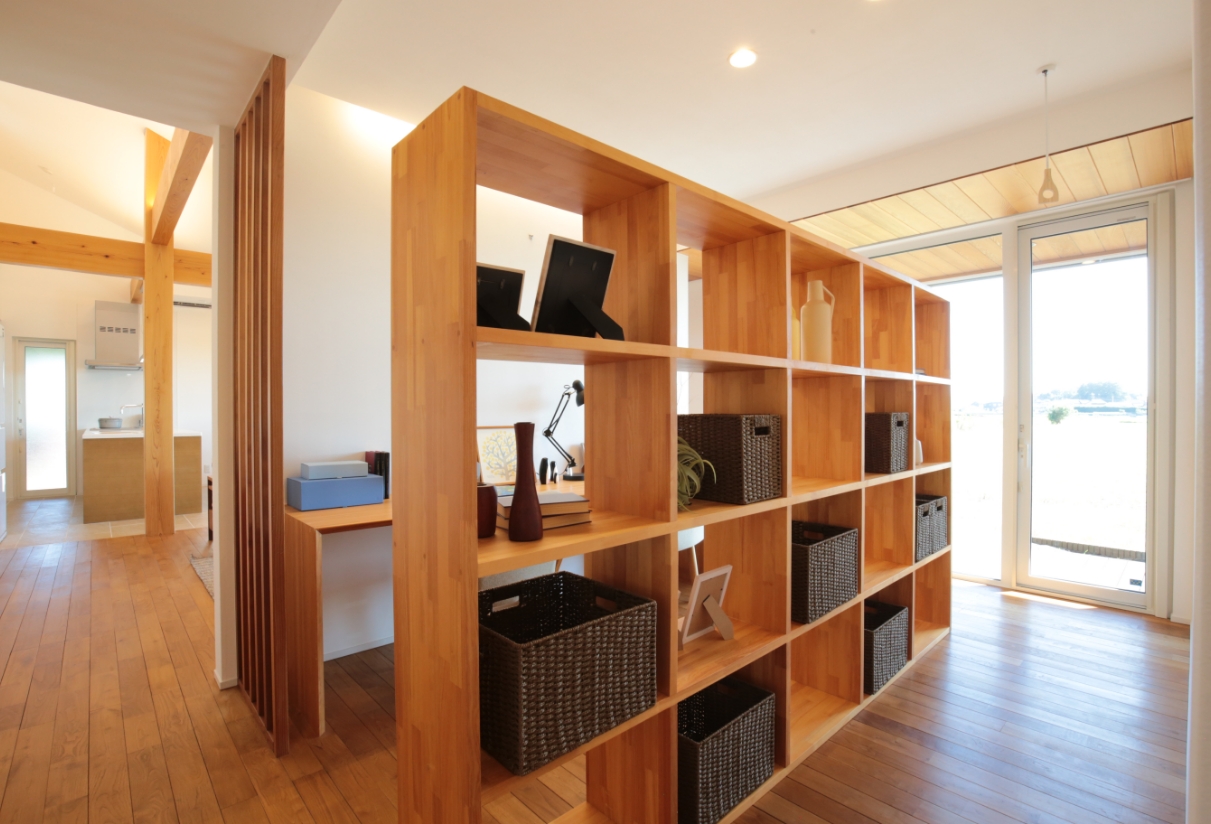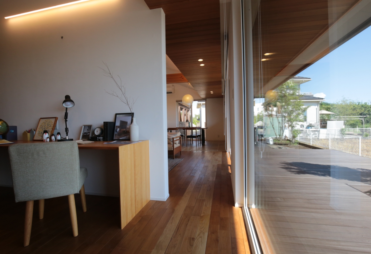 土浦モデルハウスのさくらの無垢床にも一目惚れして採用しました。間取りでは、やはり家事がしやすい動線を建築家の先生にお願いしました。スタディーコーナーとLDKの程よい距離感も気に入っています。