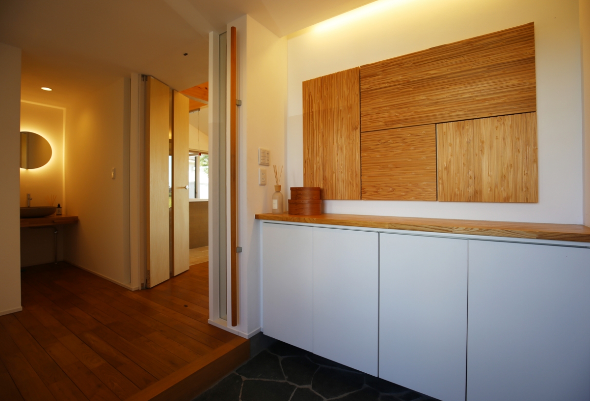 平屋のお家で回遊できる導線に、掃除しやすいように扉をすべて吊戸にしました。約27坪とコンパクトな建物ですが要望を詰め込んだお家です。