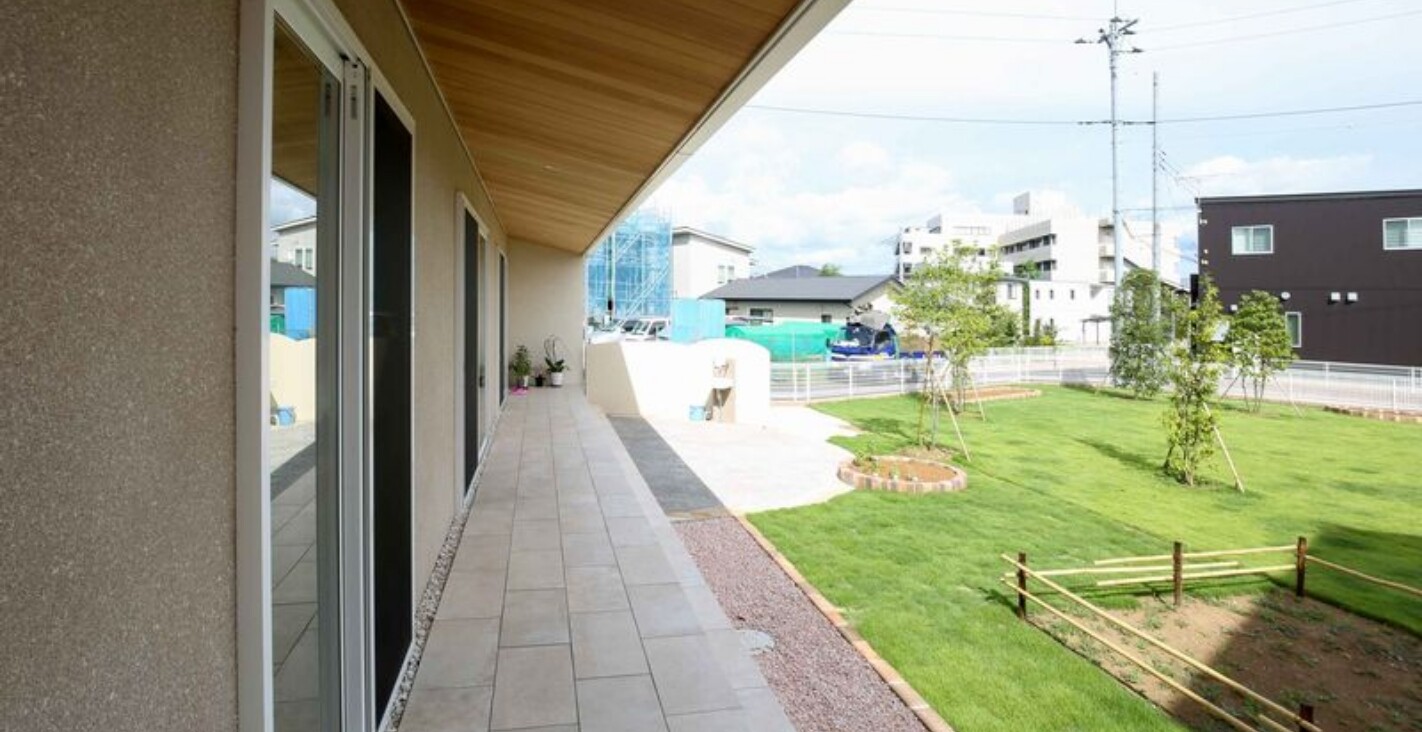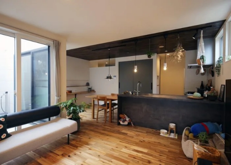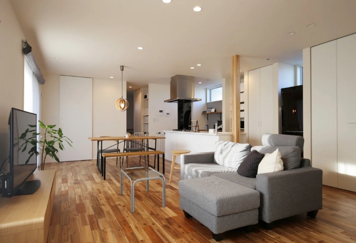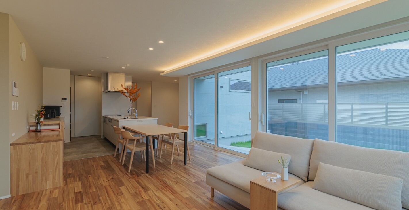開放感あふれる24帖の広々としたLDK。リビングからすぐそばのお庭を感じることができ、ワンフロアの動きやすい動線にこだわった平屋。