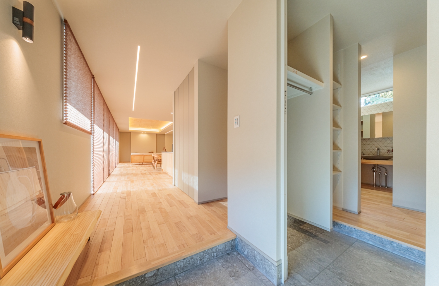 行き止まりがなく、さまざまに回遊できる平屋は、空間の広がりを体感的に感じ取れるようになっています。 ワンフロアで自由に動けるのも、平屋の魅力のひとつです。
