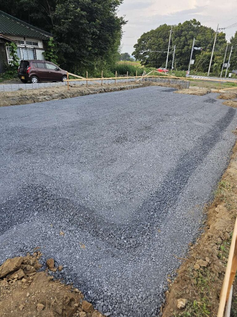 まずは基礎形状に合わせて地面を掘削し、砕石を敷いて転圧。