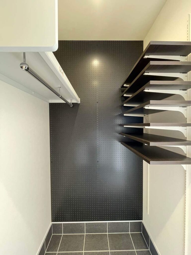 玄関を入るとまず目を引くのが、有孔ボード!