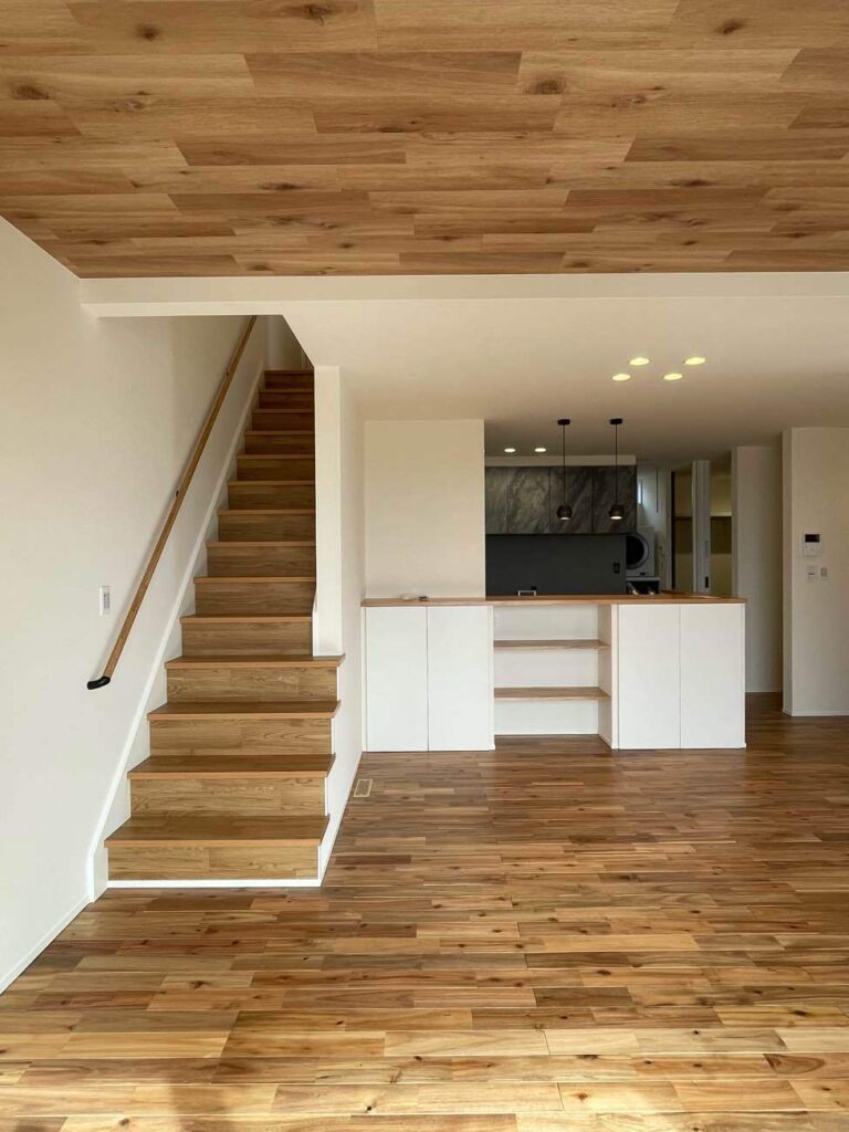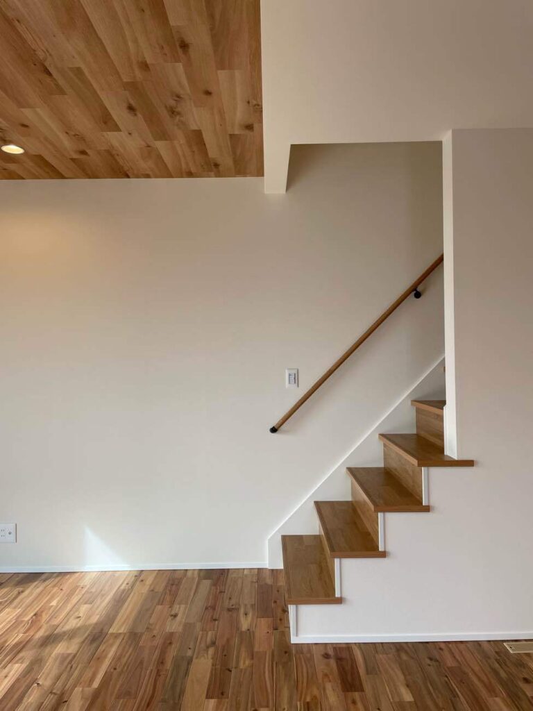 階段は、ちょっと腰掛けられるデザインで、家族のふれあいの場にもなりそうです。