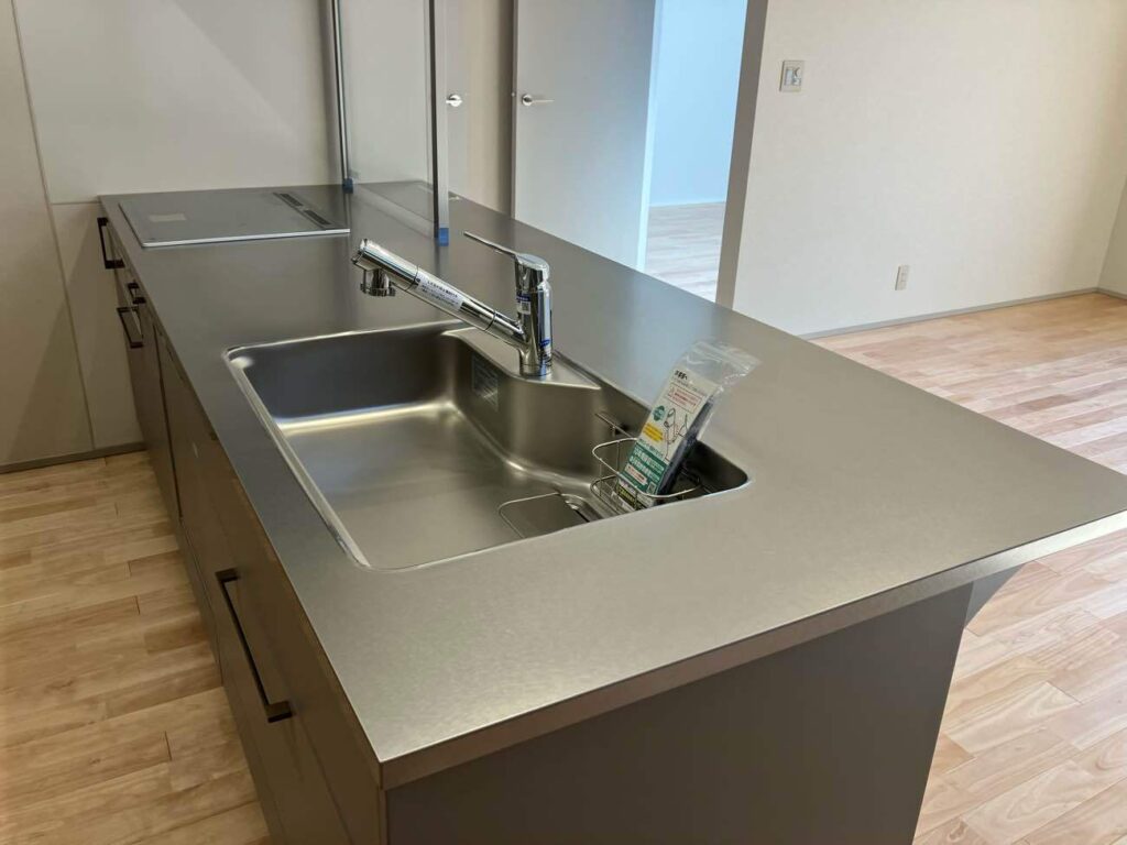 キッチンの天板は、奥様こだわりのバイブレーション加工を施したステンレス。