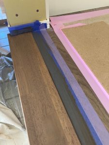 カイテキホームの特徴でもある内部塗装、カウンターや框(かまち)等を塗る作業です。