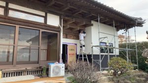 こちらの建物の玄関から右側を(玄関を含む)、外壁ごと解体し、サッシも入れ替え、金属サイディングで仕上げます。