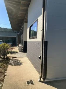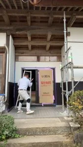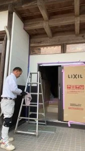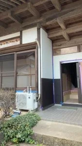 こちらの建物の玄関から右側を(玄関を含む)、外壁ごと解体し、サッシも入れ替え、金属サイディングで仕上げます。