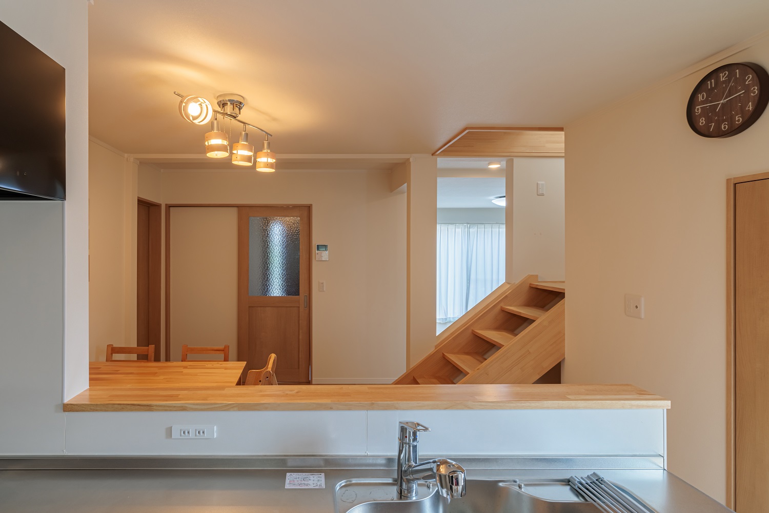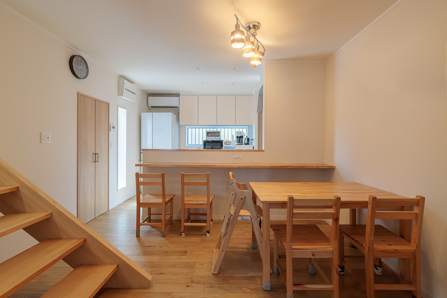 ダイニングに繋がる階段は一部、壁を無くし、開放感を出しました。リビングからの光が階段、ダイニングへ届き、明るい空間へ。