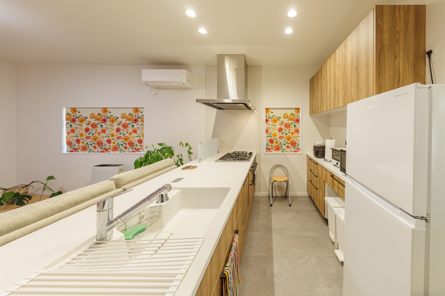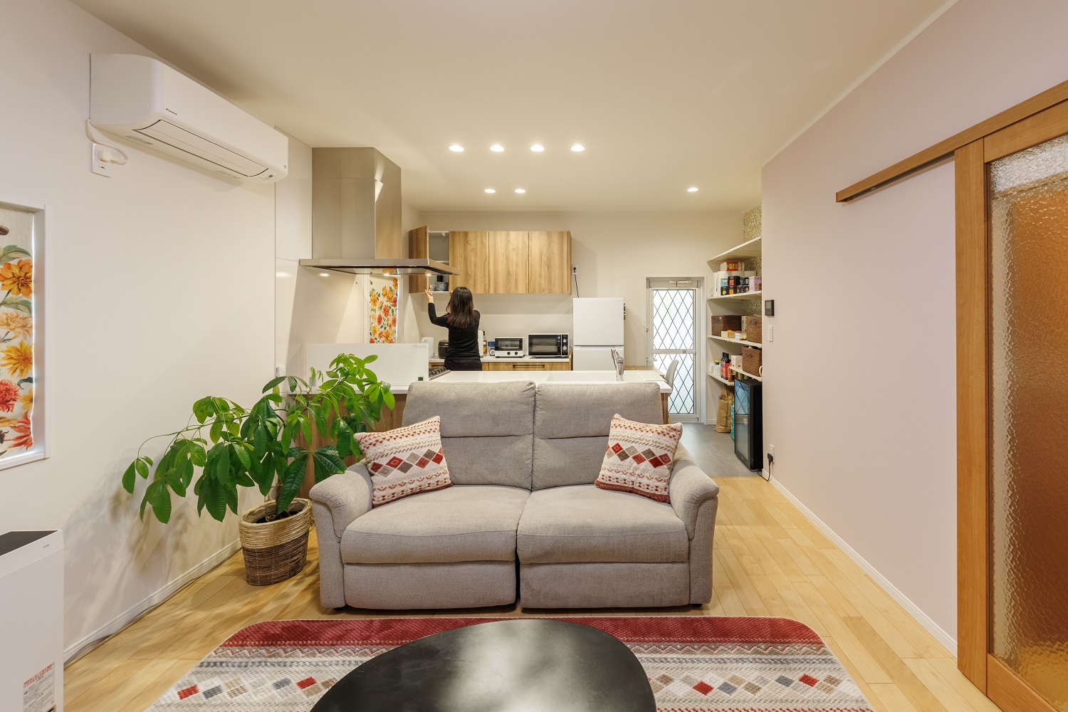 一段下がった広い土間台所がバリアフリーのLDKに。