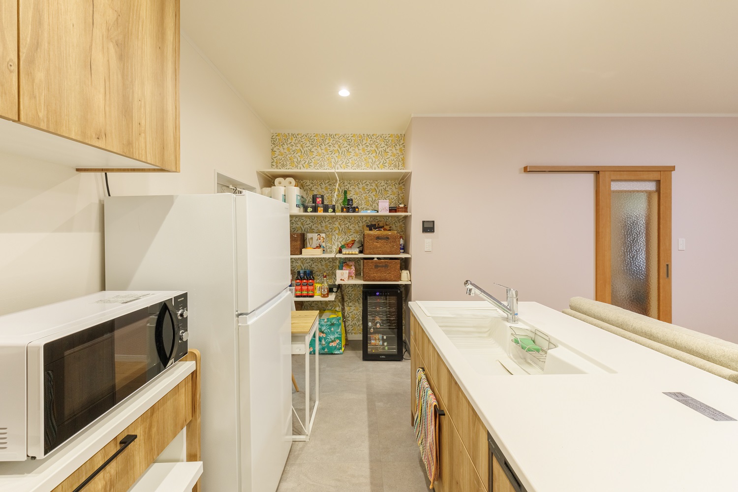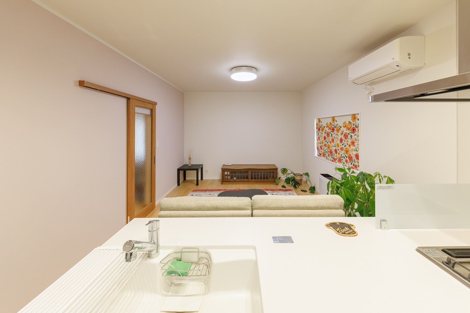 築48年実家をリノベーション。空き家の期間が長く、家の老朽化も進んでいたこともあり、安心・安全で快適に住める家へとリノベーションしました。一段下がった土間の台所がバリアフリーのLDKに変貌。昔ながらの風情を残しながらも、新しくなったLDKでは花柄やピンクなど可愛らしいクロスやシェードがアクセントになっています。