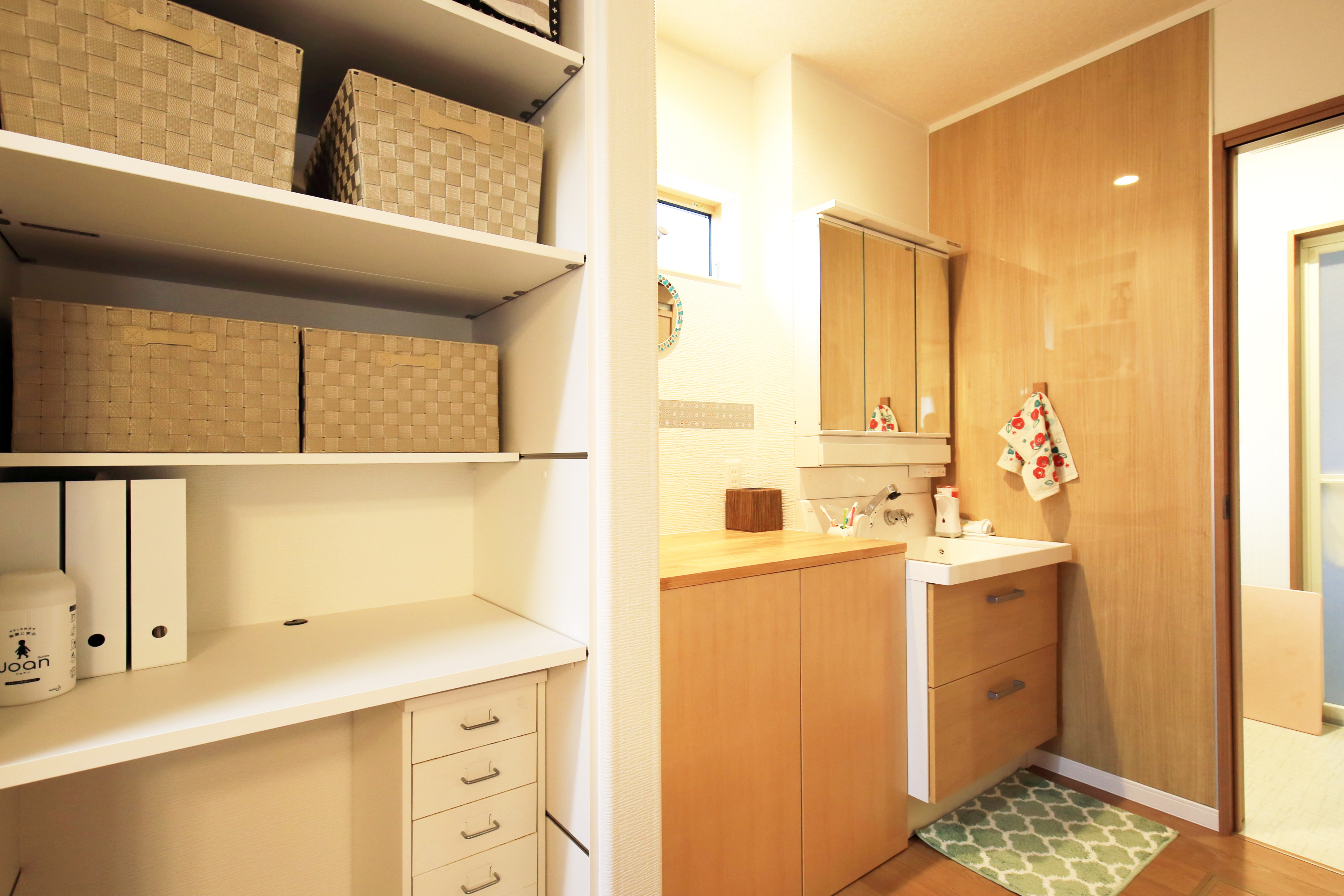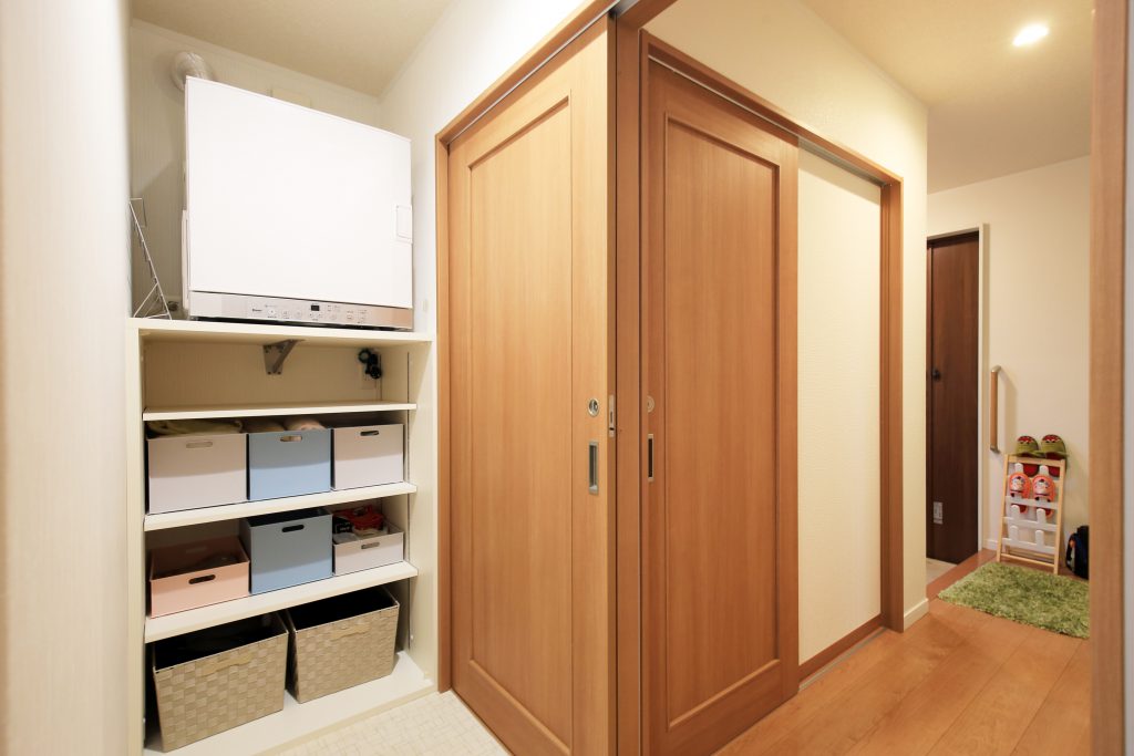 乾燥機の下には作業スペースと棚で洗濯物がここで完結します。家事の時間短縮につながります。