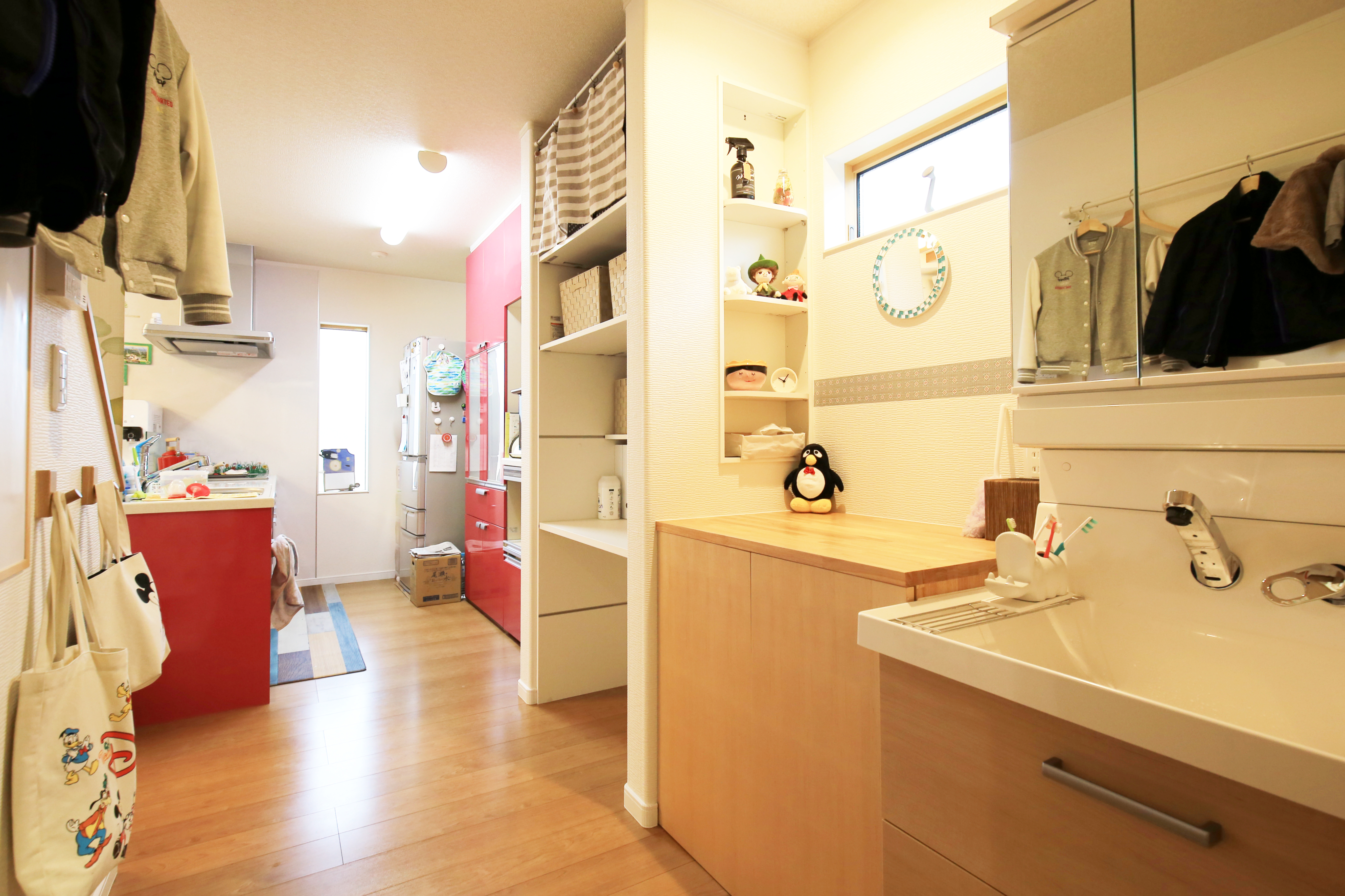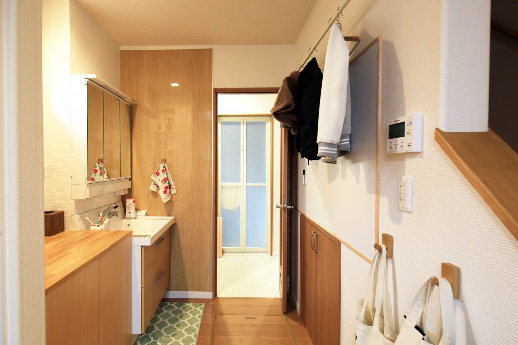既存の洗面化粧台を移動し、動線を考えた間取りに。服が掛けれるポールやホワイトボードを設置したことで、便利になりました。