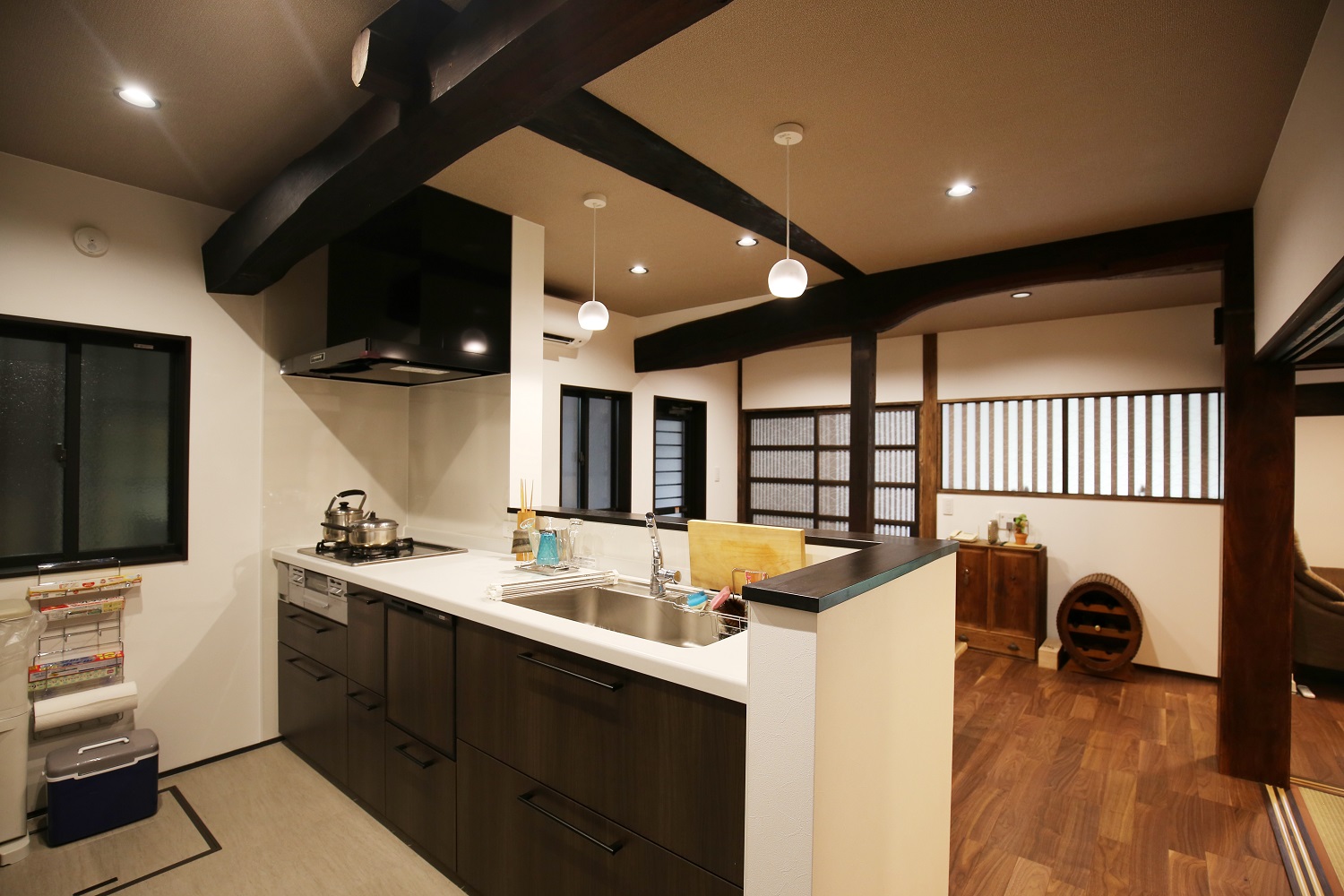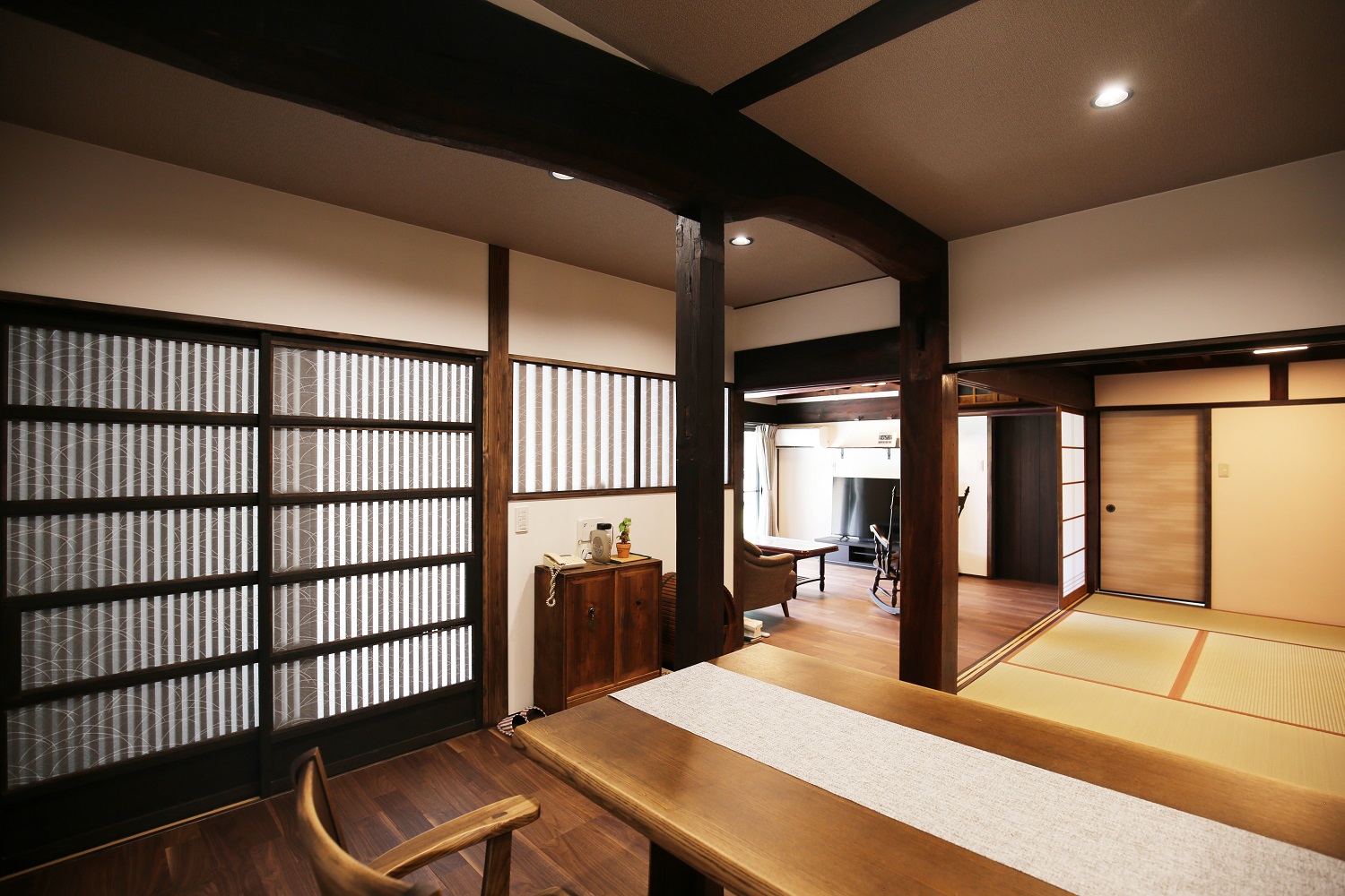 築100年の住宅を活かしたリノベーションは、残せるものは再利用し、断熱やサッシでお家の性能もアップ。気密の良いサッシに変えたことで、家の中が静かで快適に。古民家の雰囲気は壊さず、柱や梁は見えるように残し、宿のような一息つける落ち着いた空間に生まれ変わった平屋。