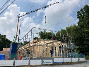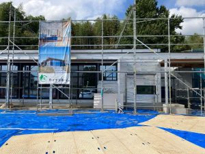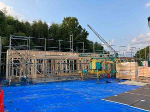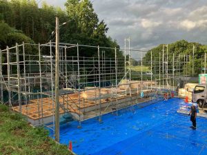 基礎が完成したら、土台敷きを行い、足場を組みます。