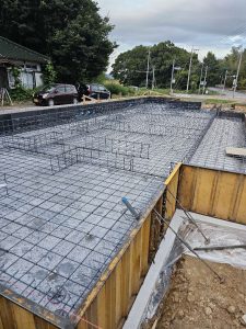 基礎の鉄筋を組み、床ベースにコンクリートを打設。