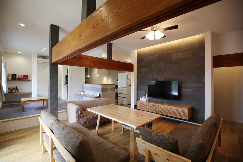 LDKです。見栄えの良いLDKにしたかったので、造作やタイル等、素材の質感や色にもこだわりました。それ以外にもSNSやモデルハウスを参考にしながら、家事動線や掃除のしやすさ、収納にもこだわりましたね。リビング裏に収納スペースを設けることで、無駄なものが省かれスッキリとしたLDKが実現できています。